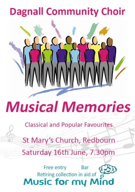 Admission to the concert is free, with a retiring collection in aid of Music for my Mind, a charity which improves the quality of life and well being of people affected by dementia through listening to personalised music.