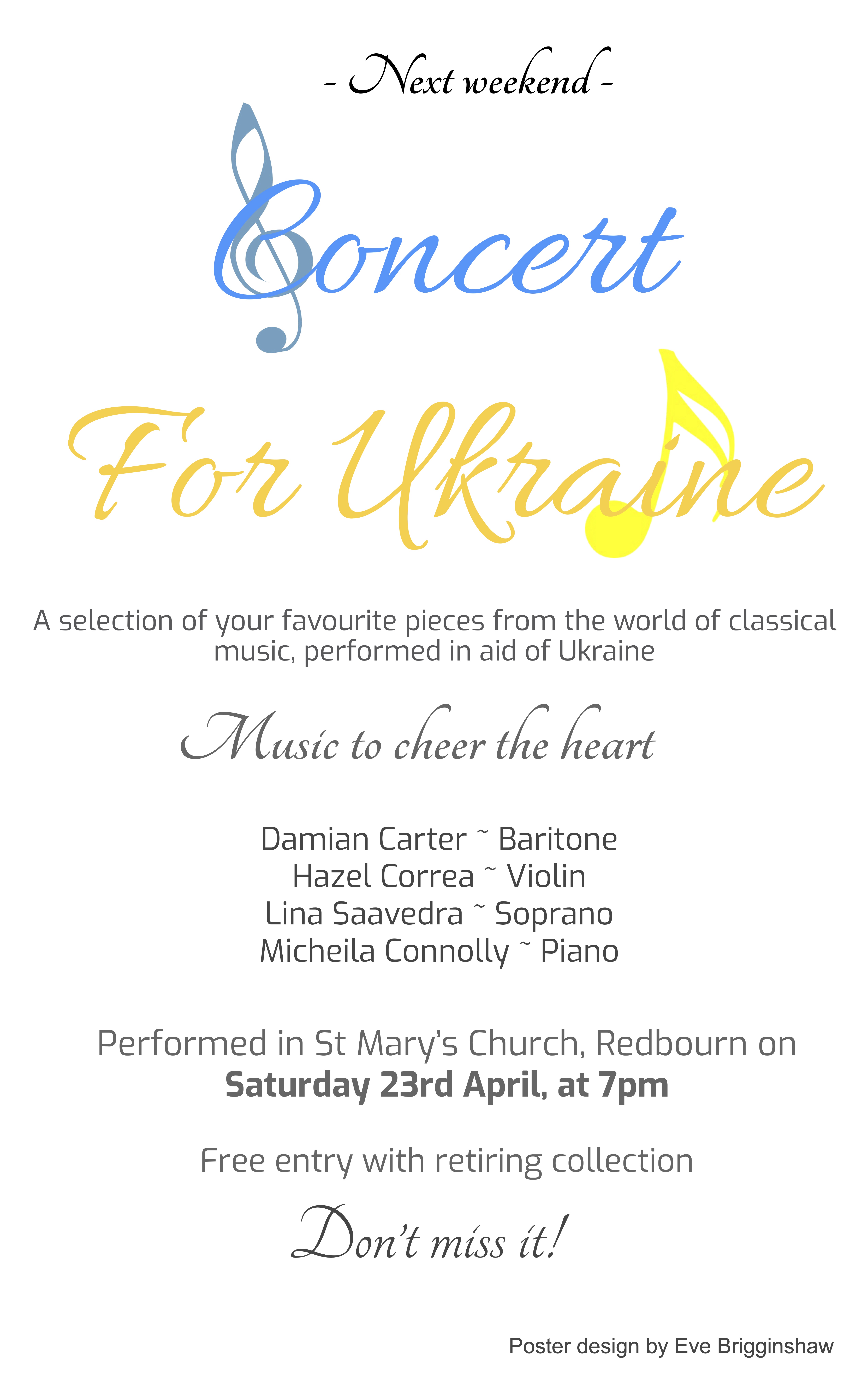 Please join us for a concert of favourite pieces from the world of classical music, performed in aid of Ukraine. Saturday 23rd April, at 7.00pm, in St Mary’s Church, Redbourn.