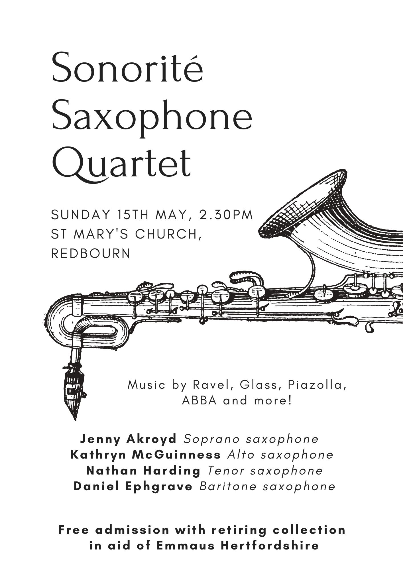 Please join us for a charity concert by Sonorité Saxophone Quartet on Sunday 15th May, 2.30pm in aid of our Charity of the Year for 2022, Emmaus Hertfordshire.
