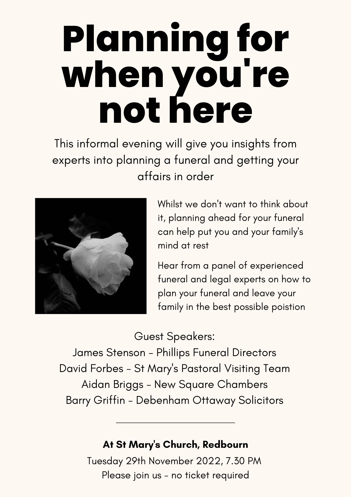 This informal evening will give you insights from experts into planning a funeral and getting your affairs in order.
