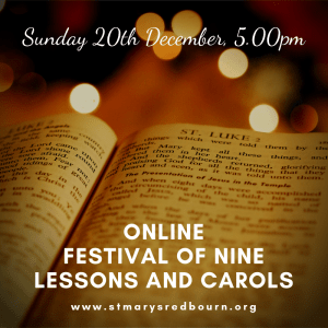 10.00 am   All Age Service As well as the services in church we will also be broadcasting a special Christmas service online via www.stmarysredbourn.org and St Mary’s YouTube channel.