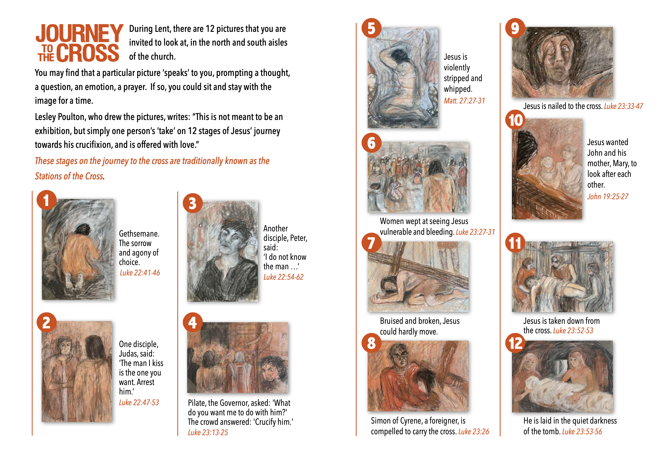 During Lent we have 12 images on display, representing Jesus’ “Journey to the Cross”, along the lines of the Stations of the Cross.