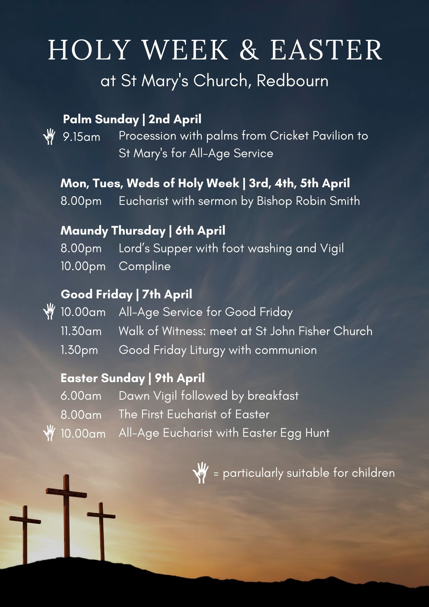 As well as our morning services in person, we offer a special Easter broadcast online via our St Mary’s website and YouTube that recalls the story of Easter in a series of powerful flashbacks. It will be well worth a look, whether you are able to come to some of the other services in person or not.