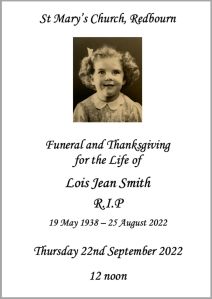 Lois’ funeral was held at St Mary’s Church, Redbourn on Thursday 22nd September, 12:00pm. For full details please visit the dedicated webpage on the funeral director’s website.